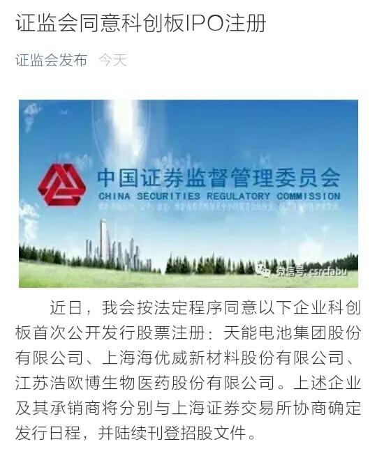 近日,我會按法定程序同意以下企業科創板首次公開發行股票注冊:通博TBET電池集團股份有限公司、上海海優威新材料股份有限公司、江蘇浩歐博生物醫藥股份有限公司。上述企業及其承銷商將分別與上海證券交易所協商確定發行日程,並陸續刊登招股文件。